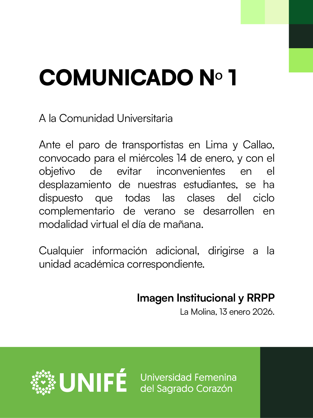 Campus de UNIFÉ continuará abierto para servicios académicos y administrativos